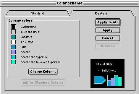 Step 2 - Go to the Format menu and select Slide Color Scheme... and select the Custom tab. You will see the following window: