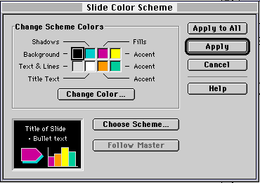Step 2. These instructions apply to PowerPoint 4.0 and earlier. For Office 98 instructions see below. Go to the Format menu and select Slide Color Scheme... You will see a window with the following choices: