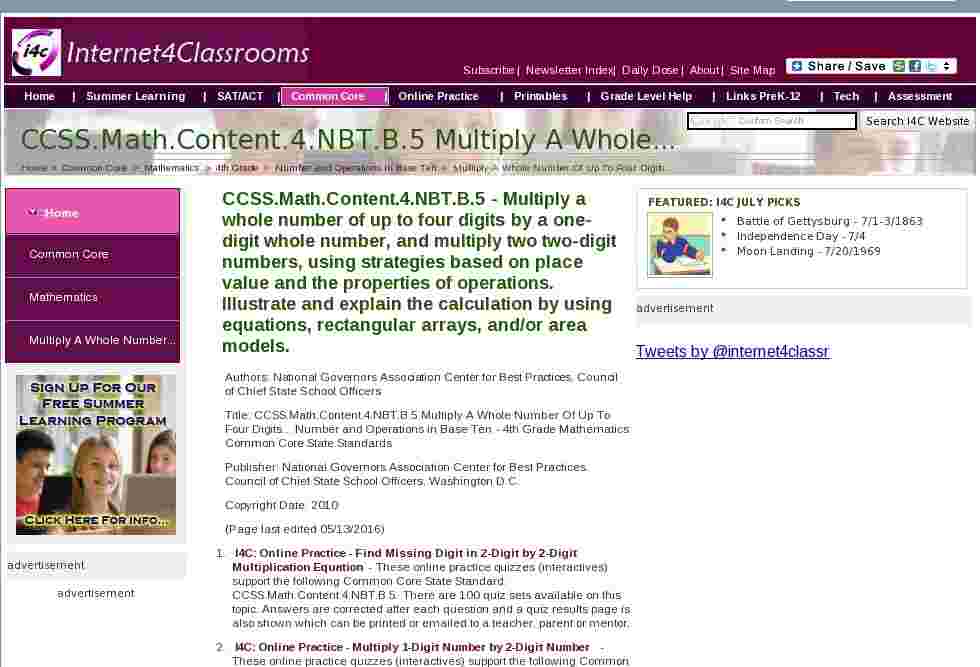 - I4C: Online Practice - Multiply 2-digit number by 1-digit number - These online practice quizzes (interactives) support the following Common Core State Standard: CCSS.Math.Content.4.NBT.B.5. There are 100 quiz sets available on this topic. Answers are corrected after each question and a quiz results page is also shown which can be printed or emailed to a teacher, parent or mentor.