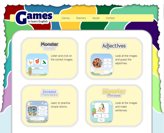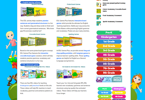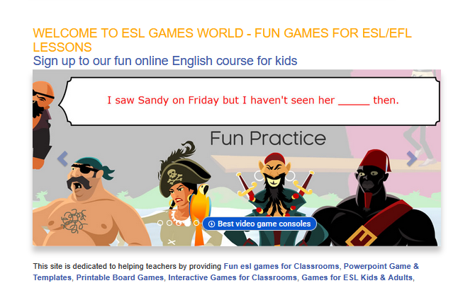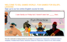This site is dedicated to helping teachers by providing Fun ESL games for Classrooms, Powerpoint Game & Templates, Printable Board Games, Interactive Games for Classrooms, Games for ESL Kids & Adults, Grammar Games, Vocabulary Games, Reading Games, featuring Snakes & Ladders, Hangman & Wheel Games. ESL Online Games SEE MORE