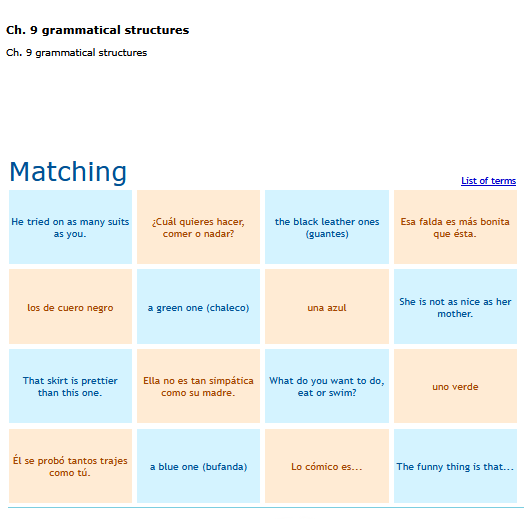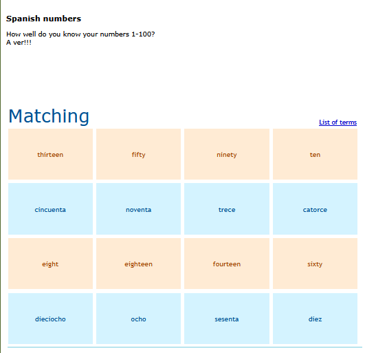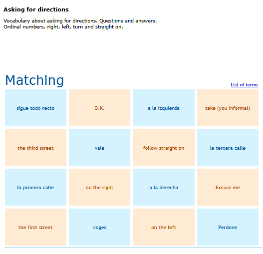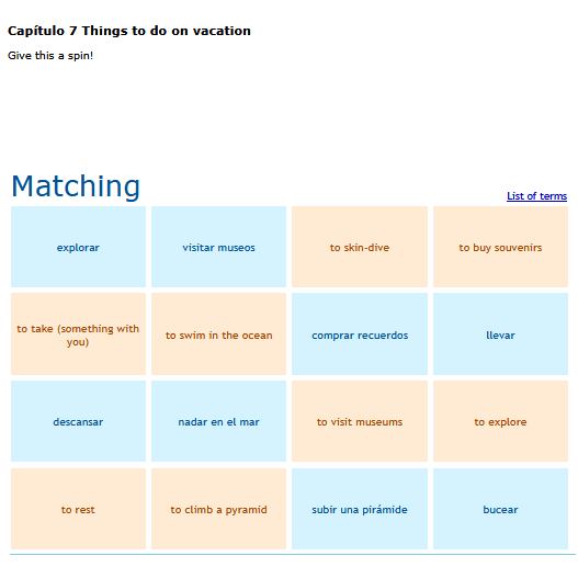 Quizzes to help you learn and review vocabulary. English word is presented with a choice of 4 Spanish words SEE MORE