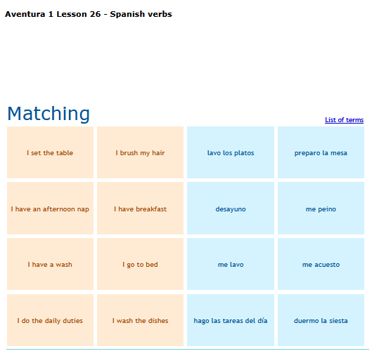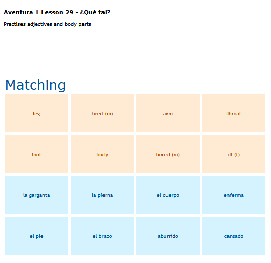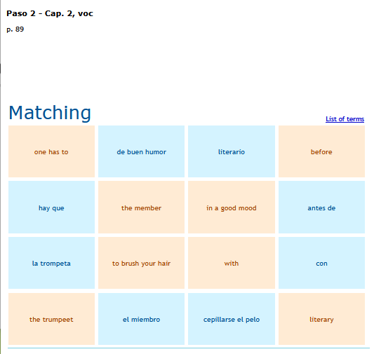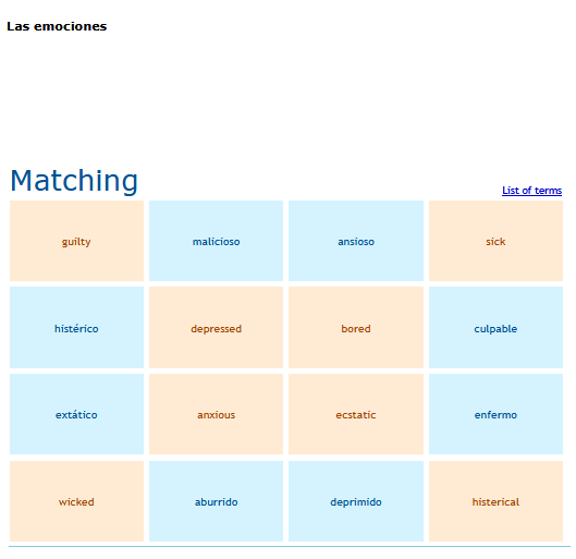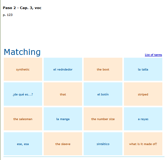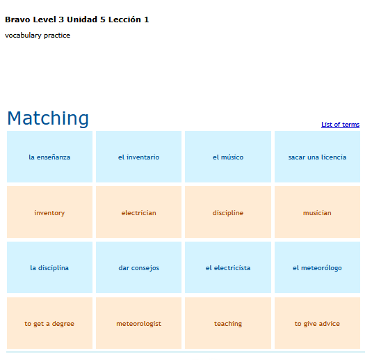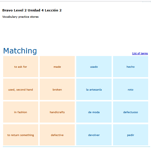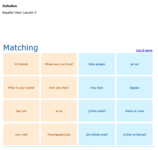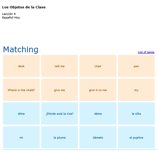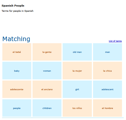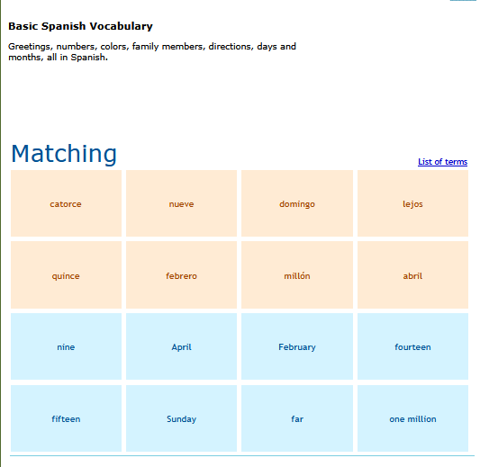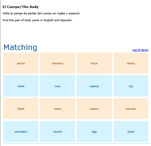A matching game of basic Spanish vocabulary words. SEE MORE