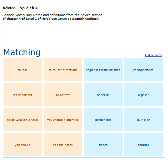 Match game. Spanish vocabulary words and definitions from the Advice section of chapter 4 of Level 2 of Holt's Ven Conmigo Spanish textbook. SEE MORE
