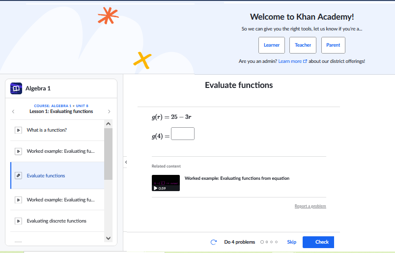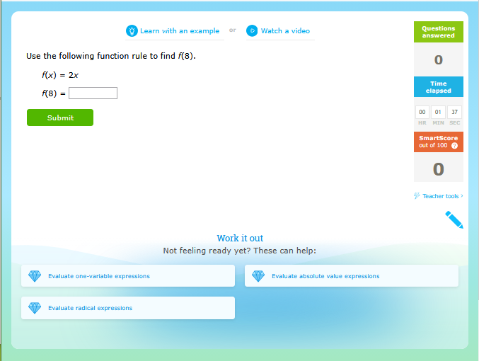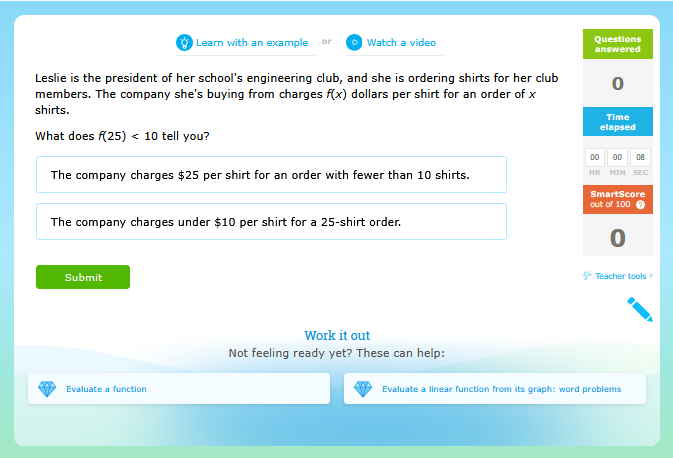 Here is a list of skills that cover algebra! The skills are organized by grade, and you can move your mouse over any skill name to preview the skill. SEE MORE