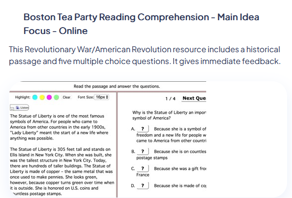 This Revolutionary War/American Revolution resource includes a historical passage and five multiple choice questions. It gives immediate feedback. SEE MORE